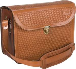 This Grand Pacific carrier bag is finely hand crafted from top grain leather. Available in brown veg-tan basketweave finish, it has a single compartment to hold many shooting accessories. A nickle plated clasp holds the bag firmly closed until you are ready to open it. Also included is one accessory pocket (it will hold another - sold separately). A 1 1/2" x 7" name space on the bag top can be custom imprinted with your name and/or logo. Overall dimensions are: 12" wide x 9" high x 5 1/2" deep. (Due to size, this ships via UPS only.)